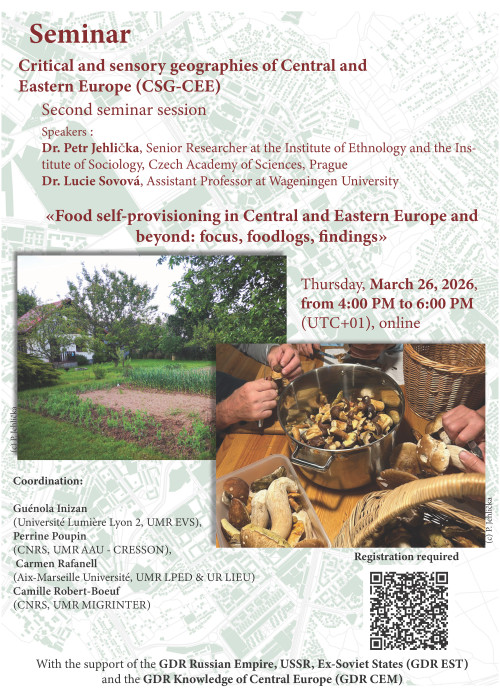 On 26 March 2026, Petr Jehlička and Lucie Sovová were speakers at the webinar ‘Food self-provisioning in Central and Eastern Europe and beyond: focus, foodlogs, findings’, organised by the French research group ‘Critical and sensory geographies of Central and Eastern Europe (CSG-CEE)’.