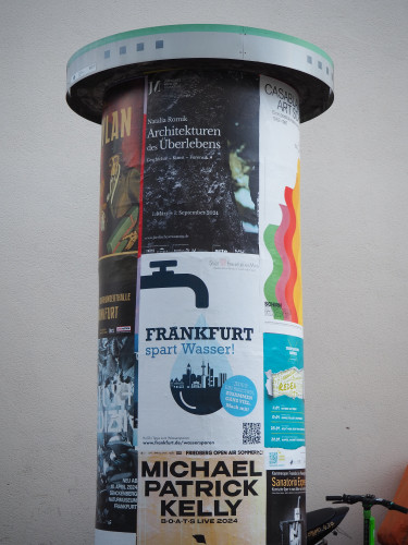 On a stroll through the city in spring 2024, passers-by are informed by large posters that “Frankfurt saves water!” (Frankfurt spart Wasser!). The appealing puns of this municipal campaign, which adorns various advertising columns in Frankfurt am Main, include Ich spar’s mir (I save it for myself), Ich dreh ab (lit. I’ll turn it off, fig. I go crazy), and Ich fang dich auf (I’ll catch you). The campaign’s website offers tips on how Frankfurt residents can save water at home, including washing fruit and vegetables in a bowl and reusing water for plants, as well as a list of water-saving household appliances such as washing machines and dishwashers – “A little bit each, a lot together.”